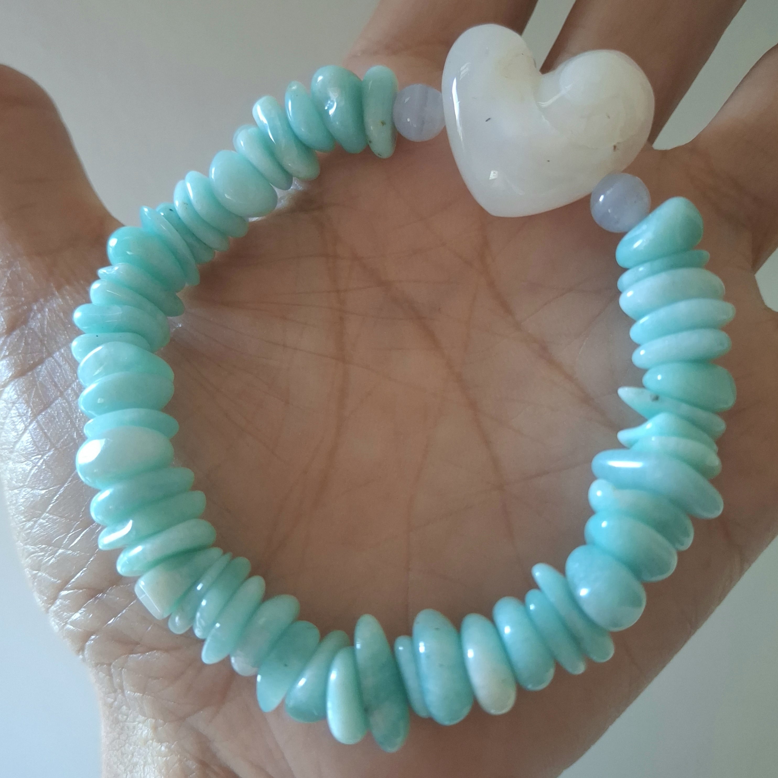 アマゾナイトのさざれにハートのスパイラルケオンをドーンとワンポイントでお付けしたブレスレット♪♪スパイラルケオンのサイドには6mmのブルーレースアゲートを飾りました。アマゾナイトの優しいアクアブルーがとても綺麗でその色味に癒されます♥️