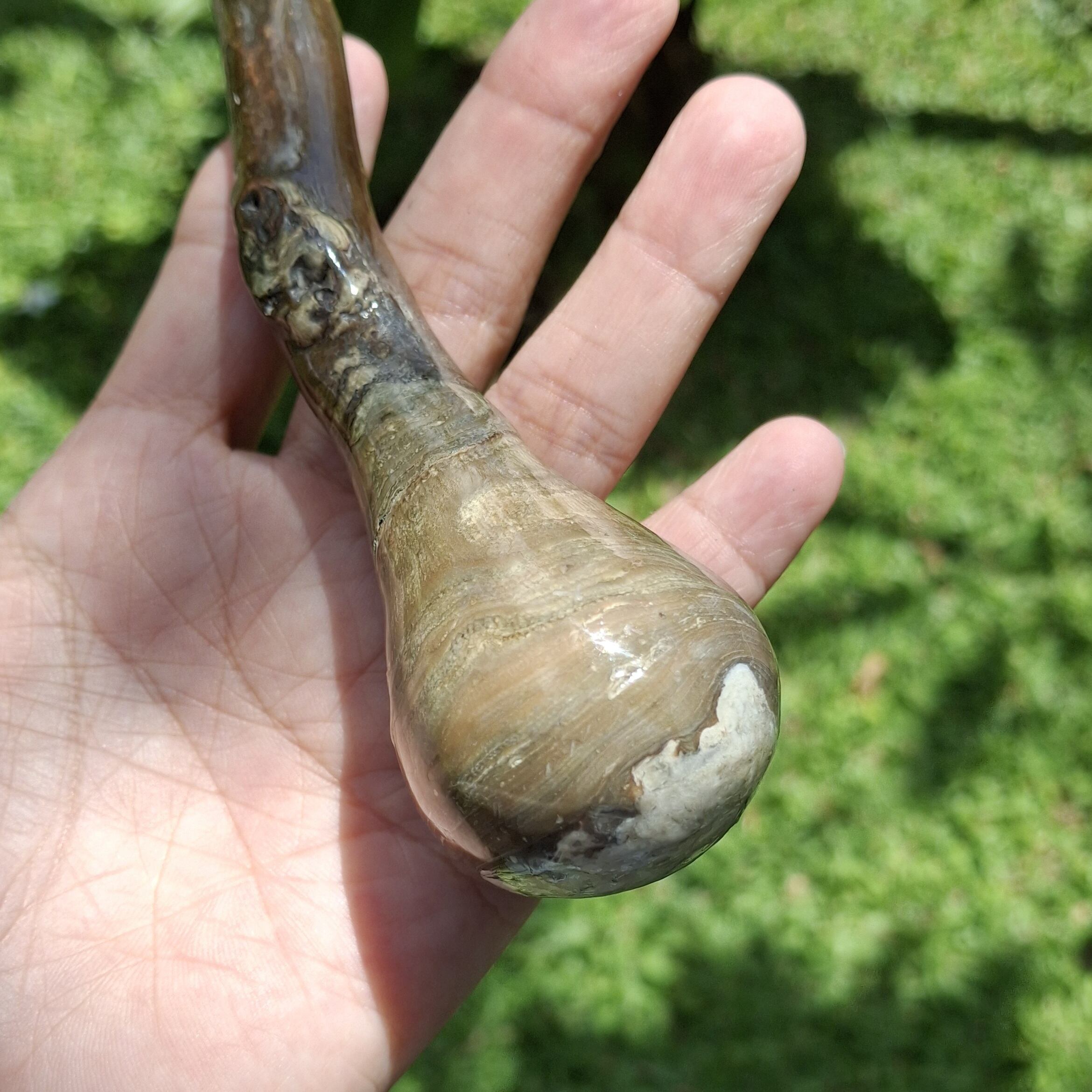 長年ウリやケオンの取り扱いをしているお店で買い付けたインドネシア産グリーンウリ·ショートワンド(スティック)。こちらは1本のウリから一つしか取れない根っこの部分を含む希少価値のあるもの。深海に生息するため、手に入れることが難しく、高額取引されています。インドネシア産のグリーンウリの色味はグリーンではなくカーキ色に近い色をしていますが、こちらは少し茶系色が強いです。根っこの部分はとても大きく、ピカピカに研磨した後は美しい模様が見受けられました!ほんとに綺麗でびっくりです♥️