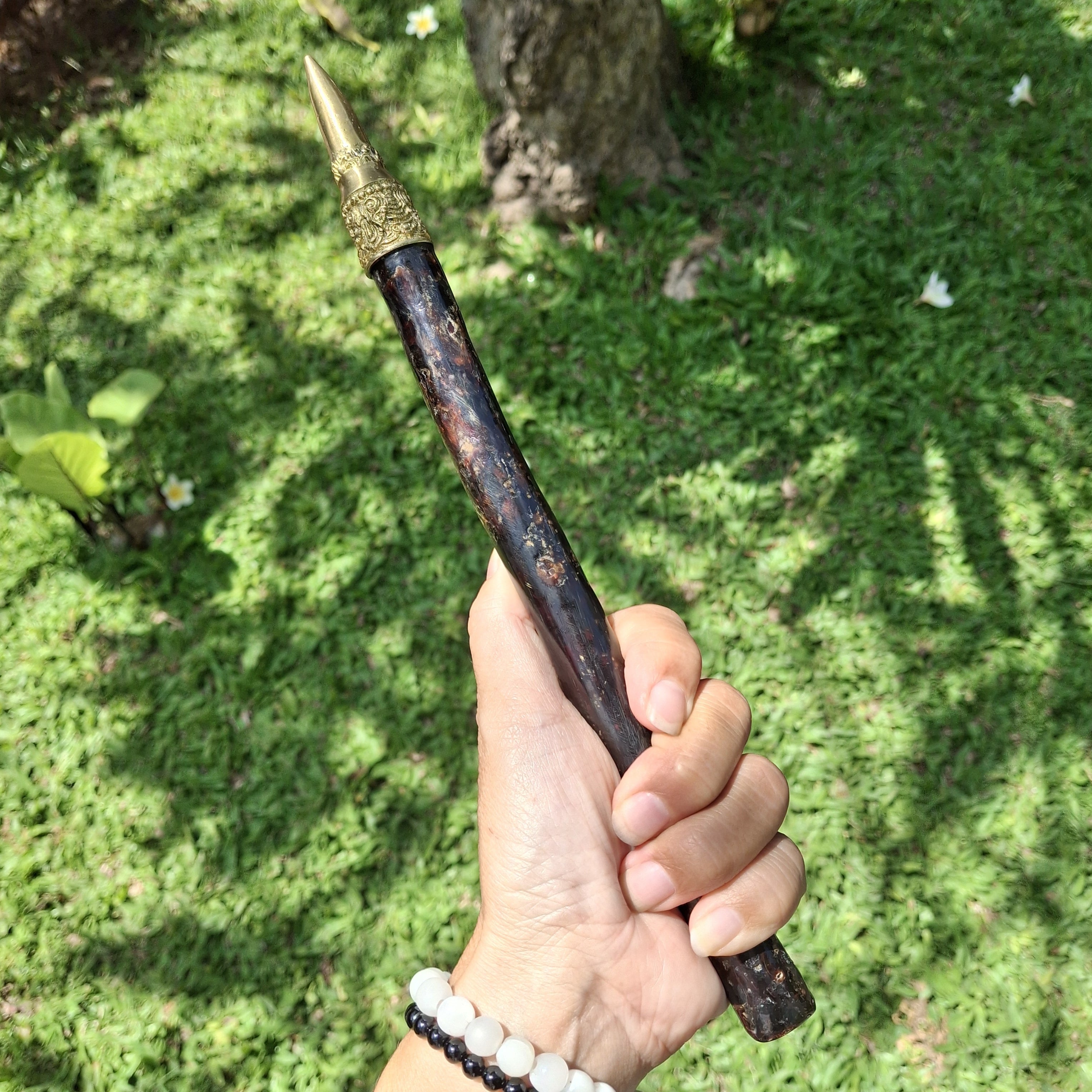 太くてずっしりとしたブラックウリ·ワンド(スティック)。タリ・アルスと呼ばれるこちらのブラックウリは、ゴールドやレッド色がキラキラと光を放ち、とても力強いエネルギーを感じられます。金具部分は真鍮なので良い感じにアンティークさが表現されていますね。こちらをブンブン振り回して邪気祓いしてみて下さい^^/