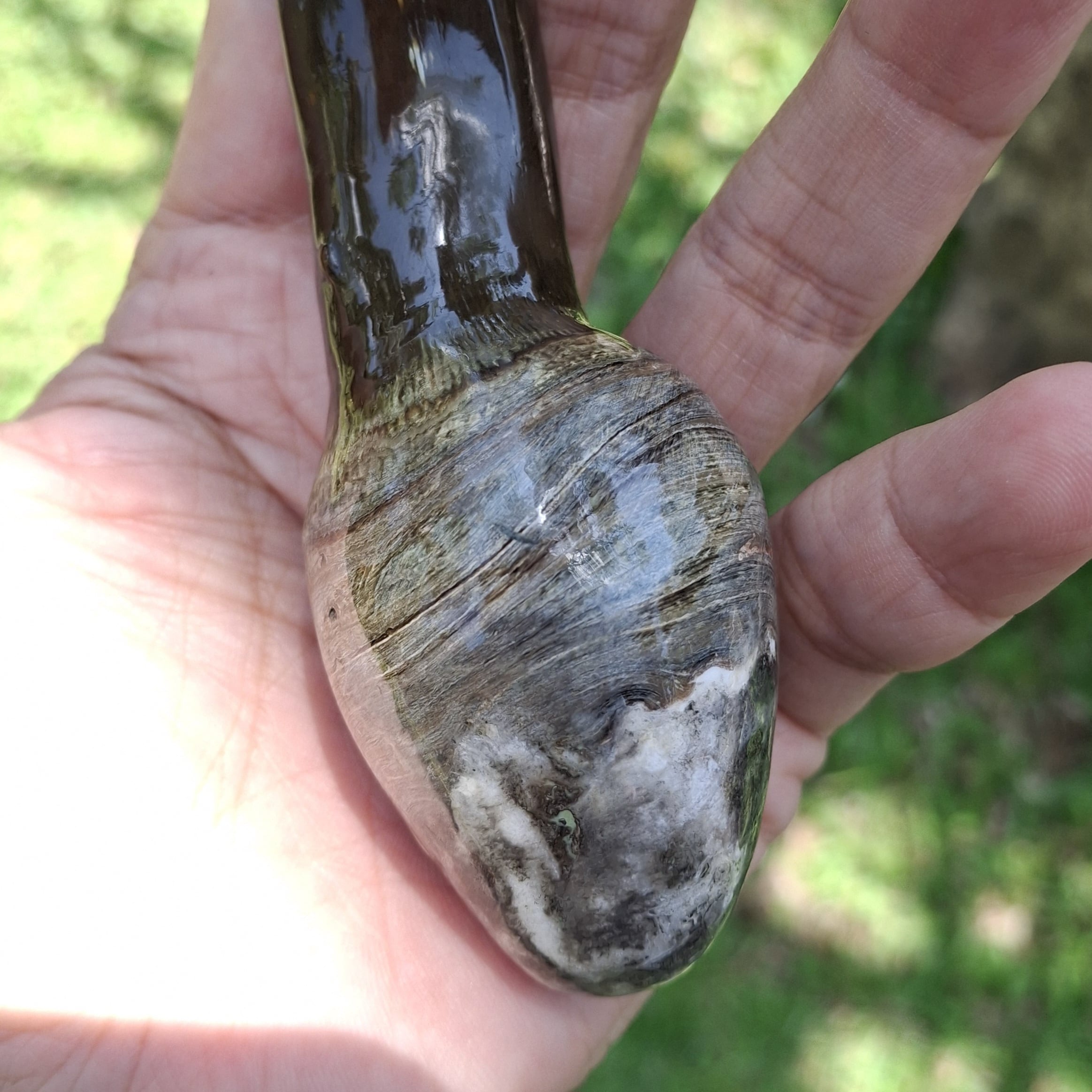 長年ウリやケオンの取り扱いをしているお店で買い付けたインドネシア産グリーンウリ·ショートワンド(スティック)。こちらは1本のウリから一つしか取れない根っこの部分を含む希少価値のあるもの。インドネシア産のグリーンウリの色味はグリーンではなくカーキ色に近い色をしていますが、こちらは少し茶系色が強いです。根っこの部分はとても大きく、太さもあります。そして根っこの部分をピカピカに研磨した後は美しい模様が見受けられました!ほんとに綺麗です♥️