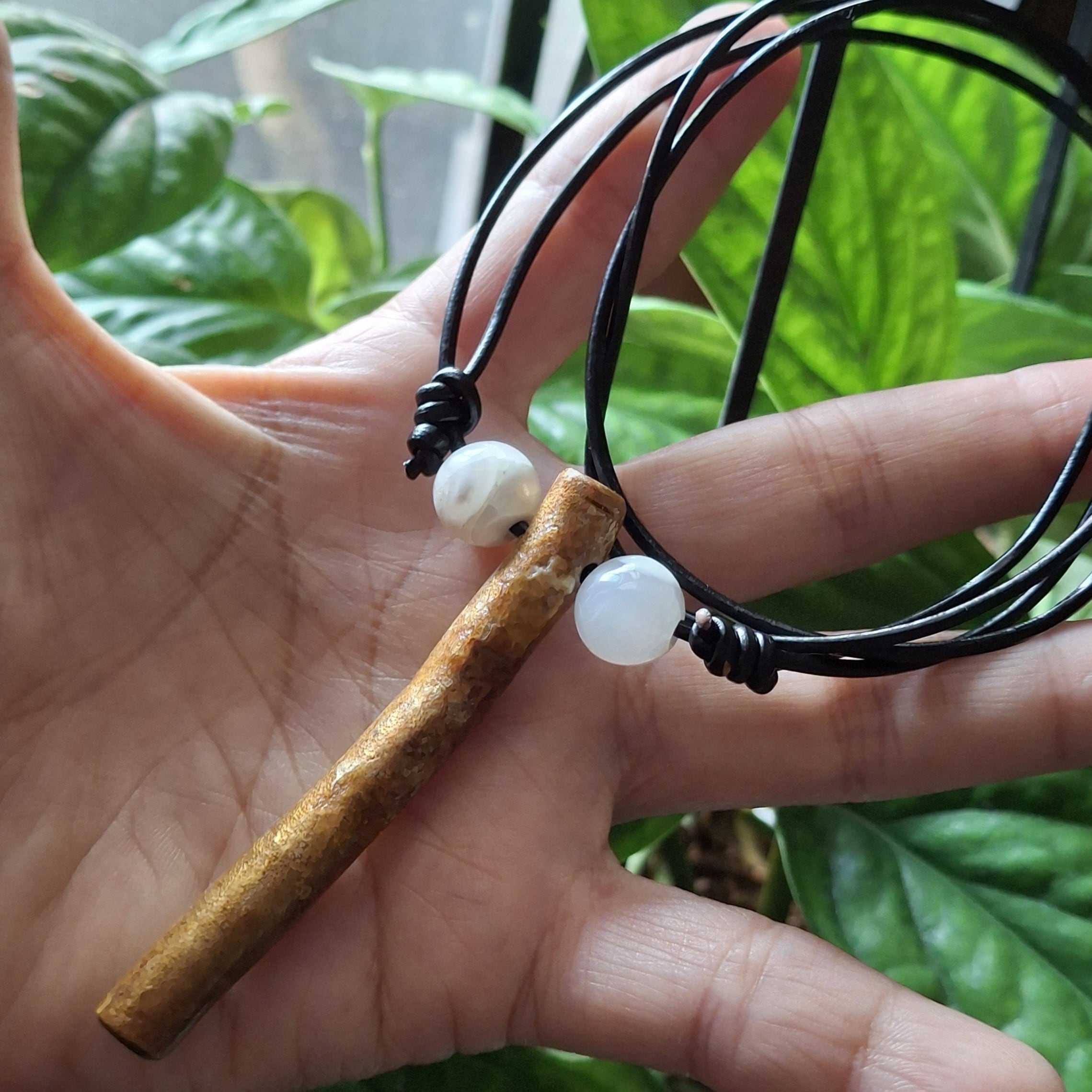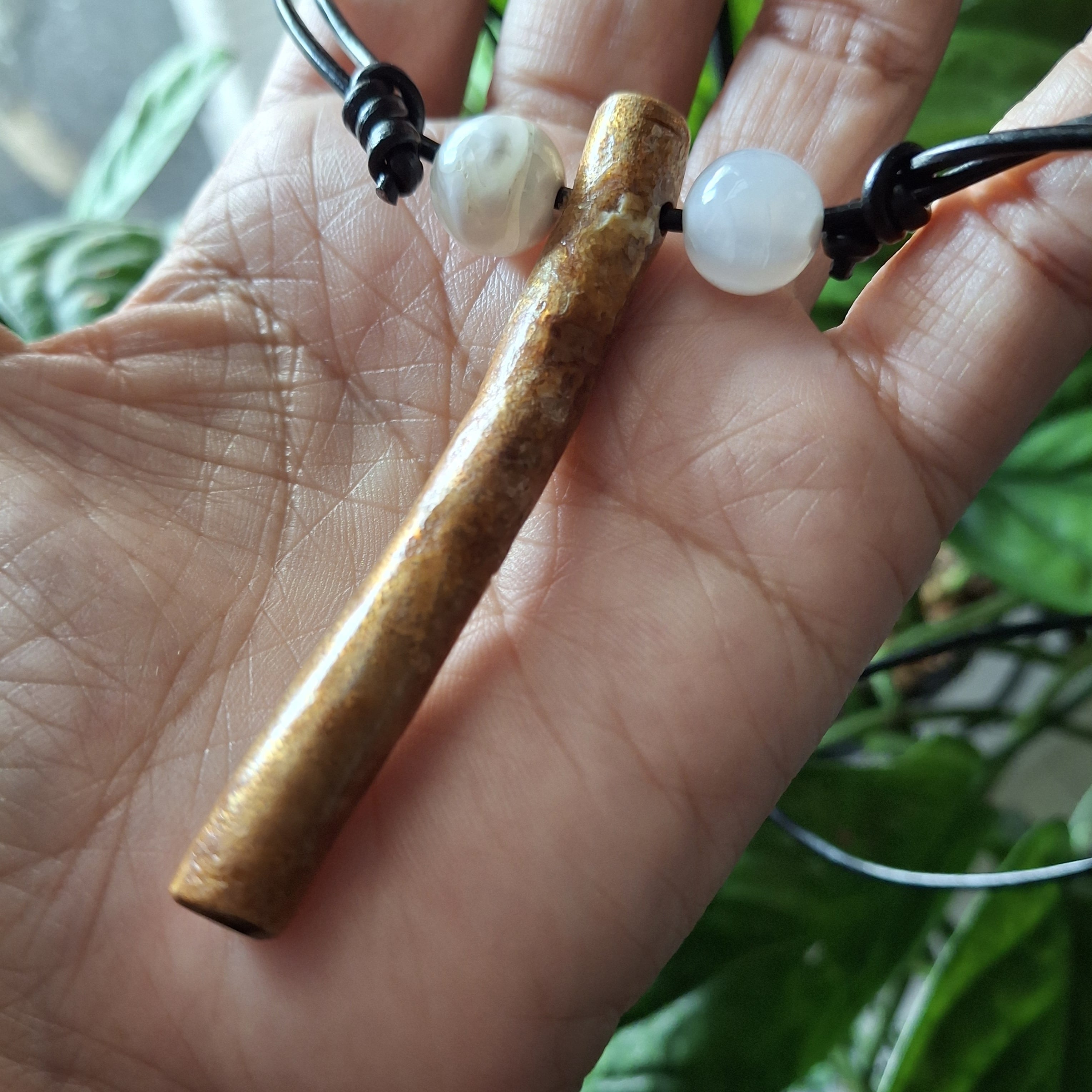 金色に輝くゴールドウリ(マスウリ)スティックと約11mmの芯ケオンビーズを組み合わせた革紐のネックレスです✨シンプルで身に付けやすいアイテム♫