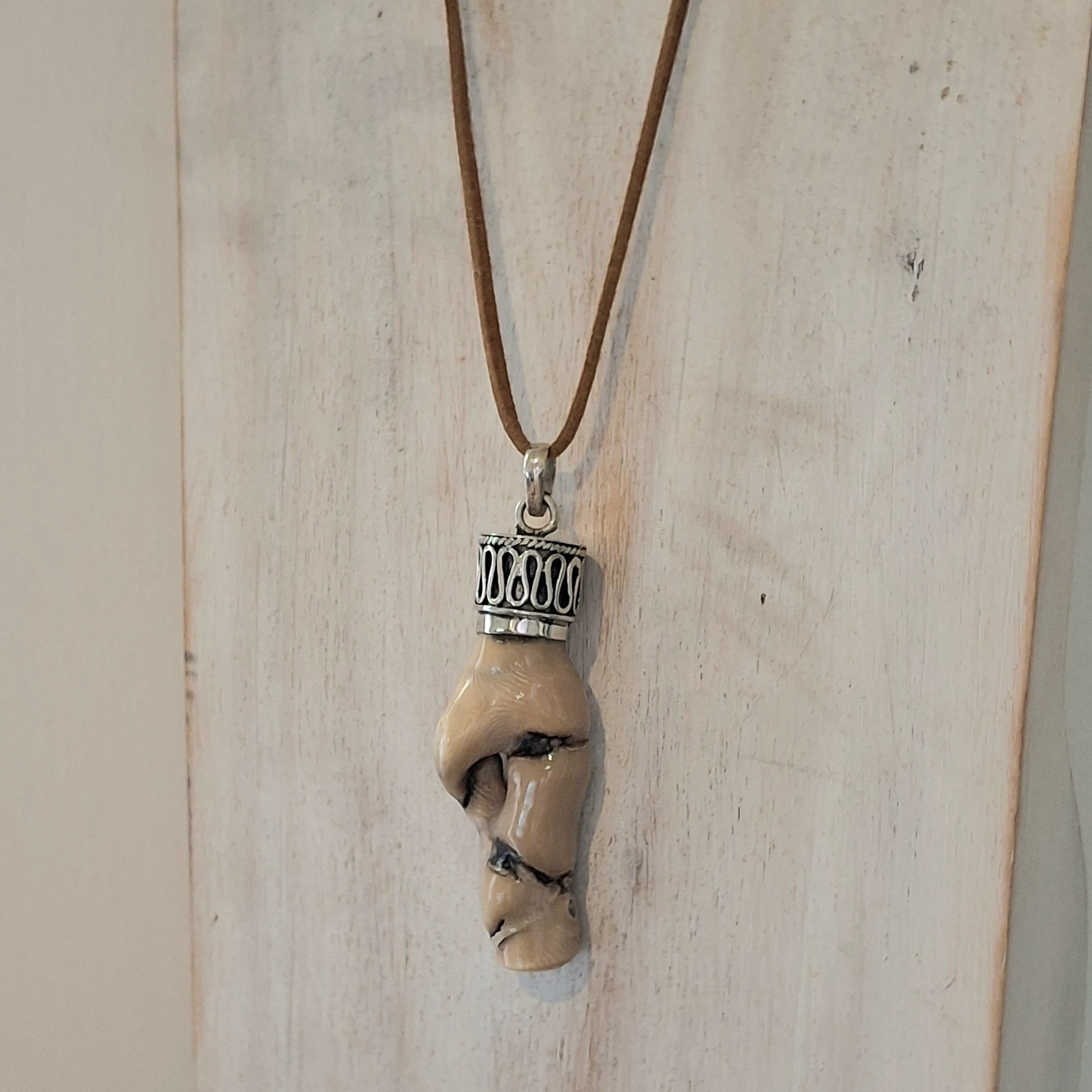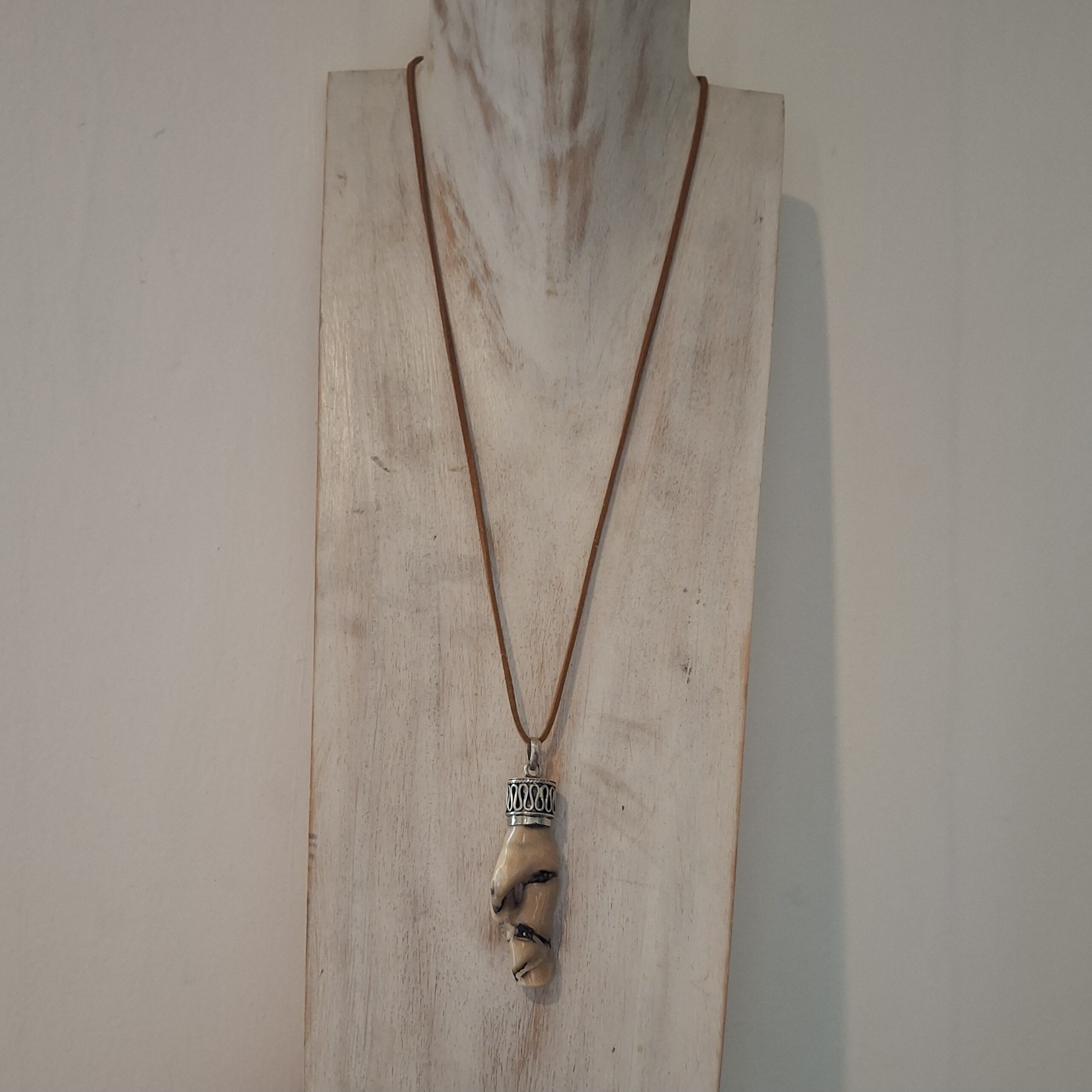 タイガーウリのペンダントとスパイラル(渦巻き)ケオン付きのスエードネックレスを組み合わせ、シンプルでカジュアルに仕上げました。普段使いはもちろん、さまざまなコーディネートに合わせやすく、天然素材ならではの個性を楽しめる一点です。
