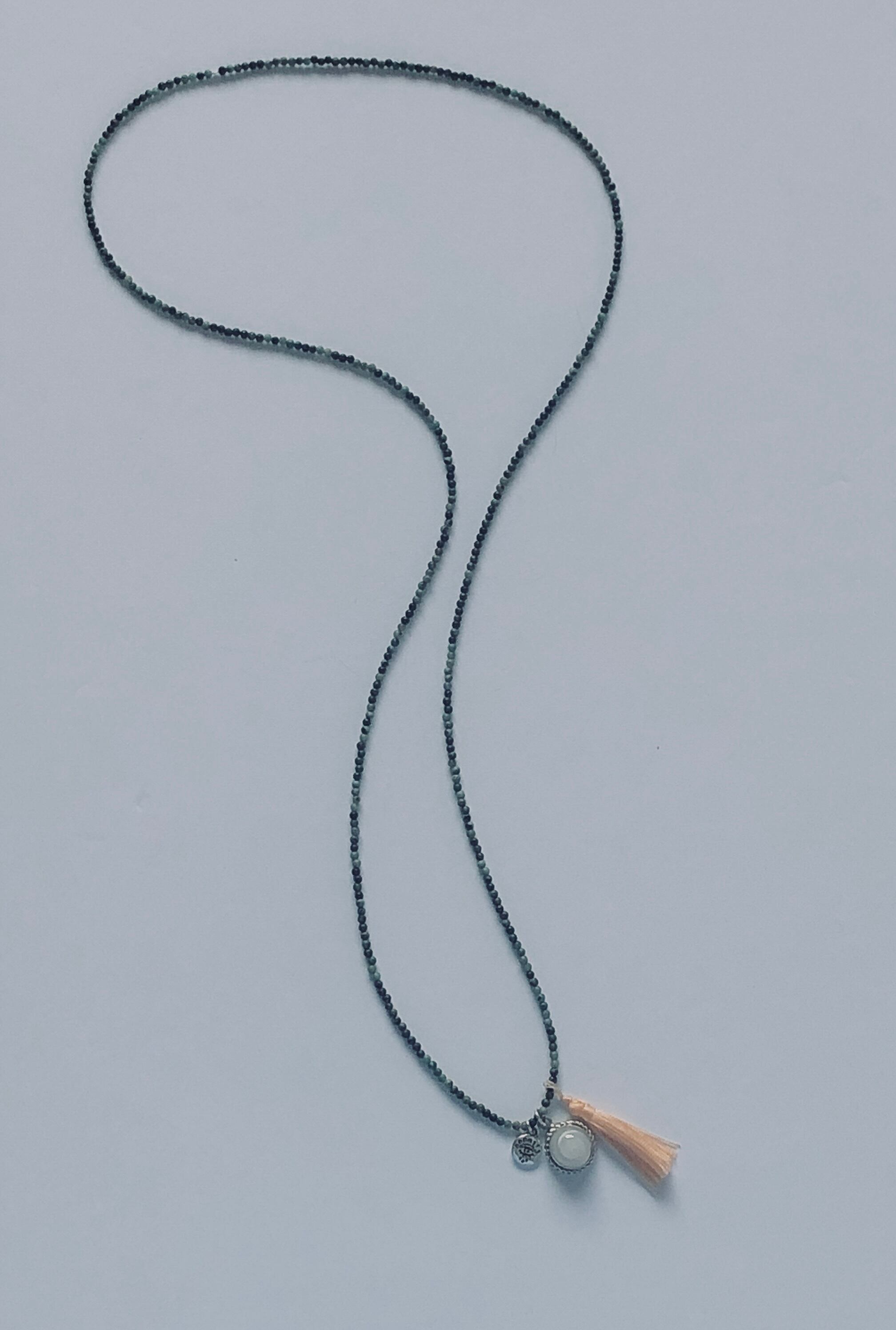 こちらアフリカンターコイズにケオンのチャームとシルク製タッセルが付いたロングネックレスになります♡タッセルを首もとにおいても可愛いです✨