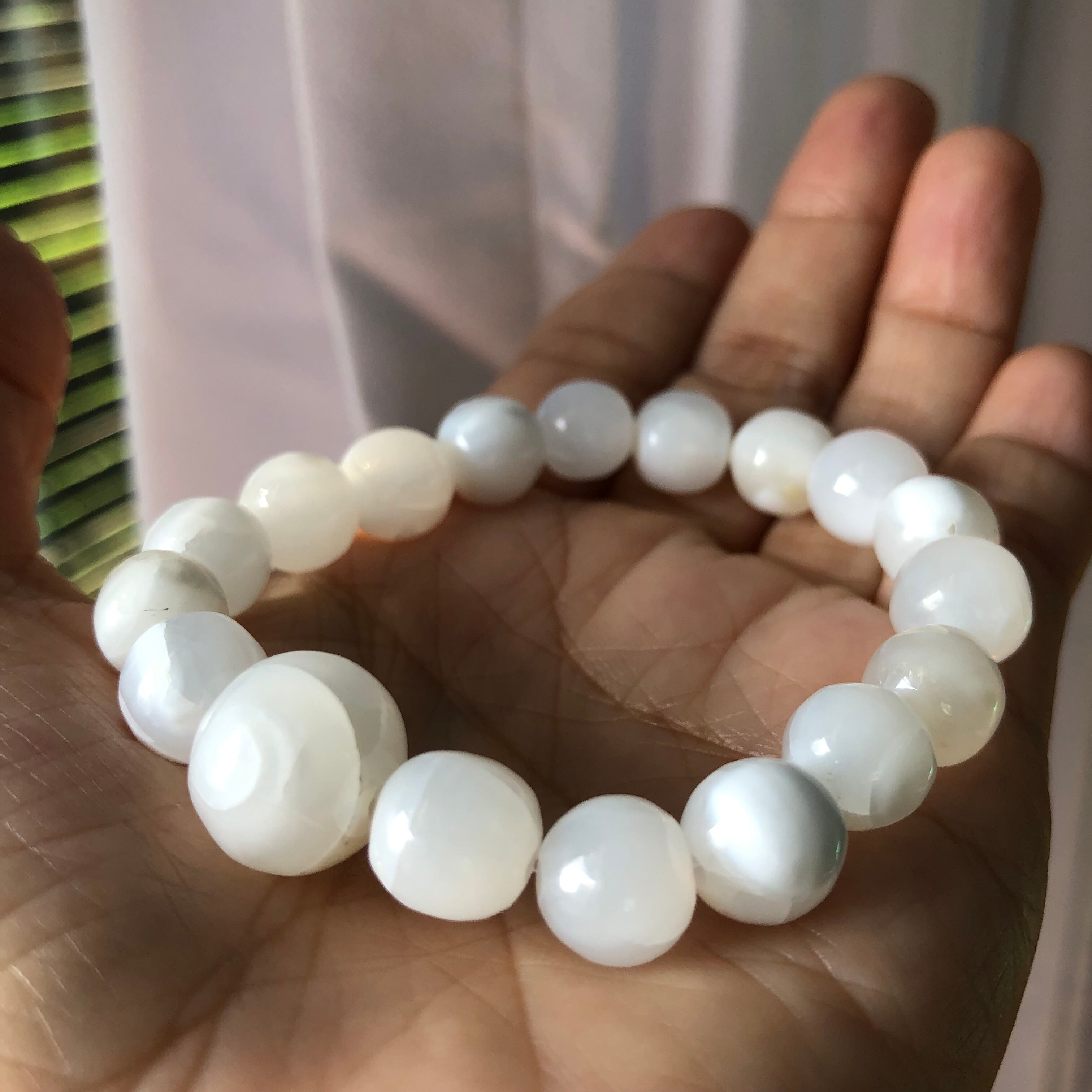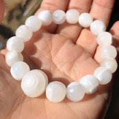 渦巻が大ぶりのスパイラルケオンと芯の部分を職人さんに丸玉ビーズ加工していただきました。芯ビーズ約10mmの中に約14mmの大玉スパイラルケオンビーズ1粒をアクセントに入れたブレスレット。とても素敵に仕上がりました♡
