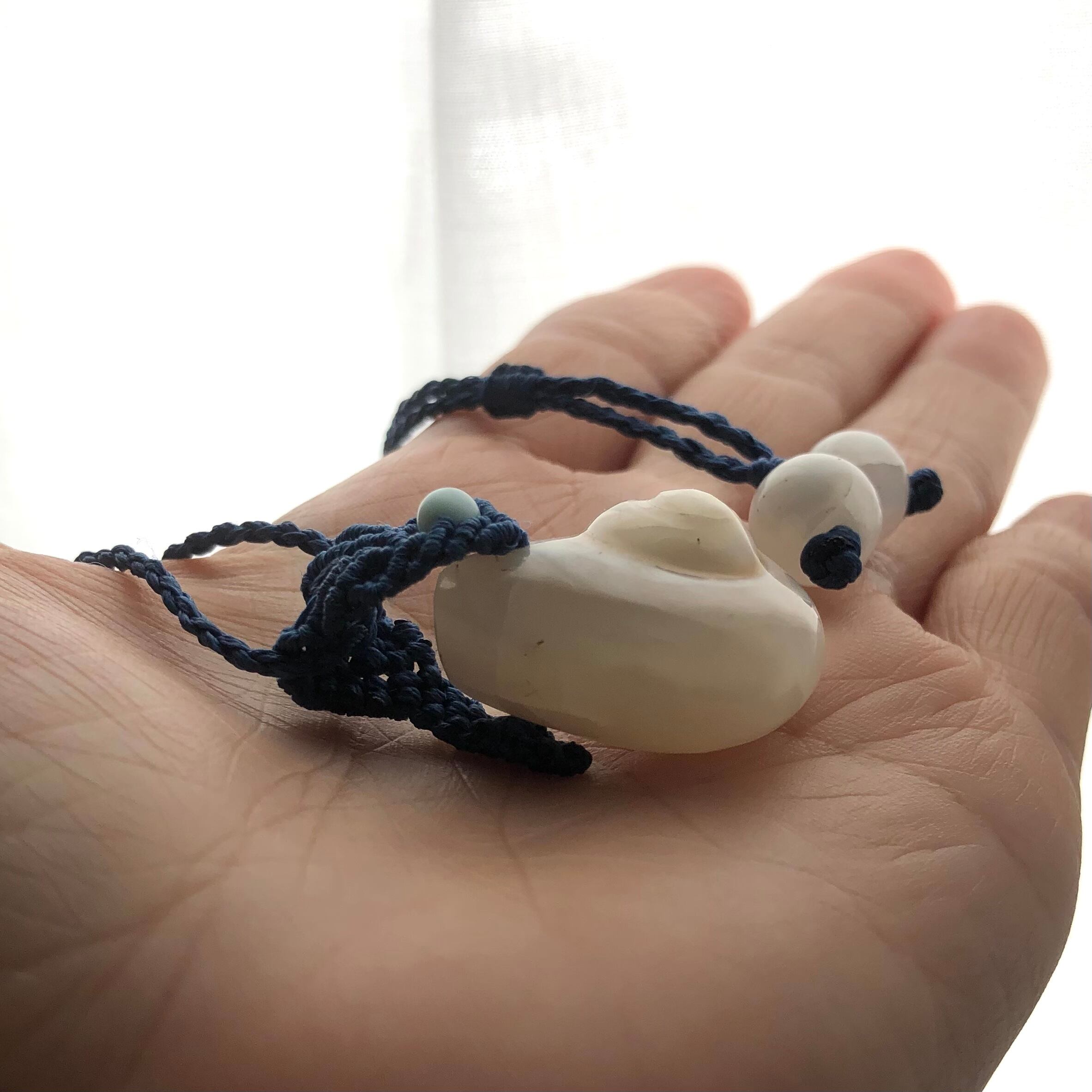 クリーミーな色合いに透明感のあるブラウン系の色味が渦巻に沿って流れる神秘的なスパイラルケオン。こちらのスパイラルケオンを0.8mmのワックスコードを使用し、バチカン部分に小粒のラリマーを中央に1個入れて仕上げました。ストラップには約10mm玉のケオン芯ビーズをアクセントに♬