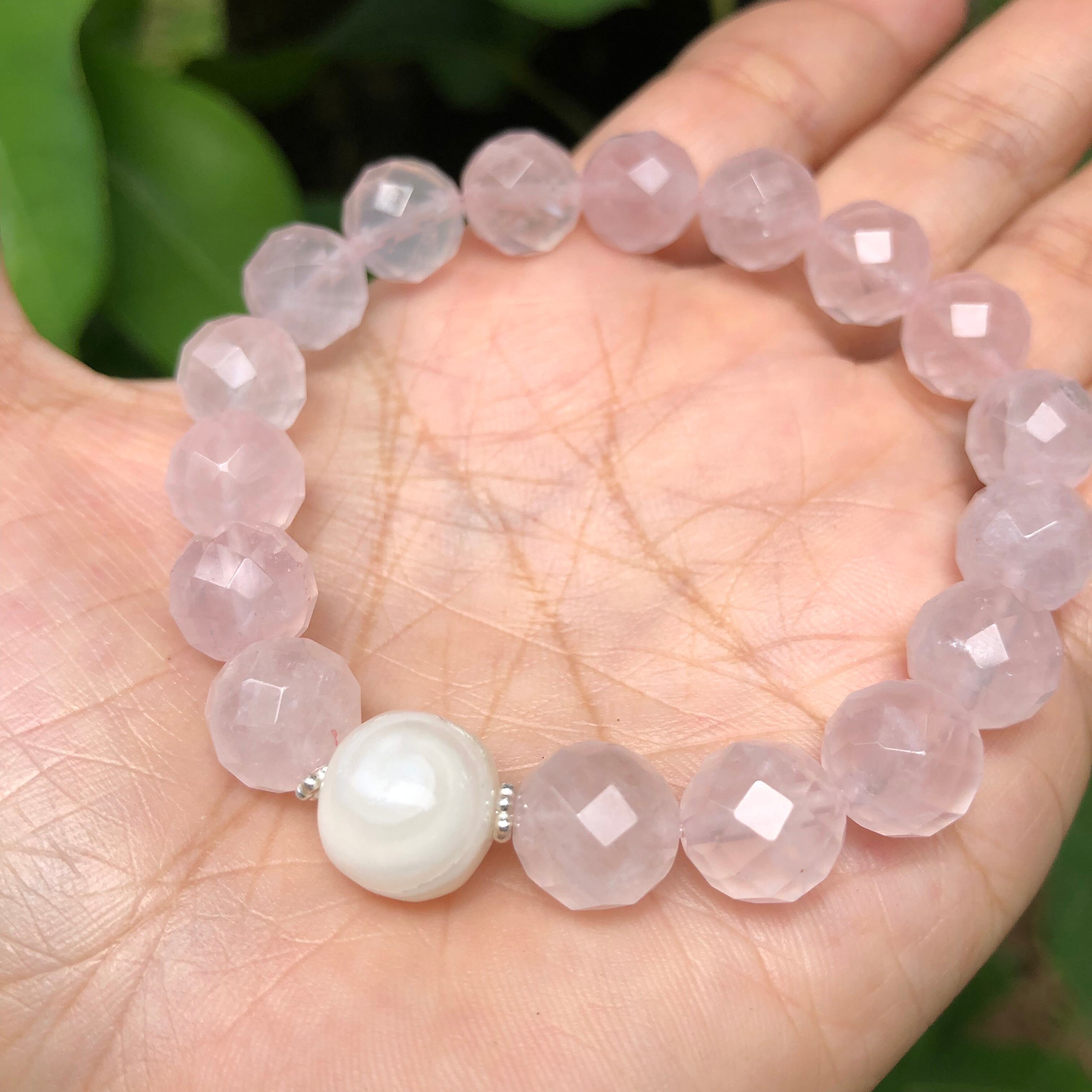 ミラーボールカットのキラキラしたローズクウォーツに大玉のスパイラルケオンビーズとシルバーパーツがアクセントになったブレスレット♬とても可愛いらしく仕上がりました♡