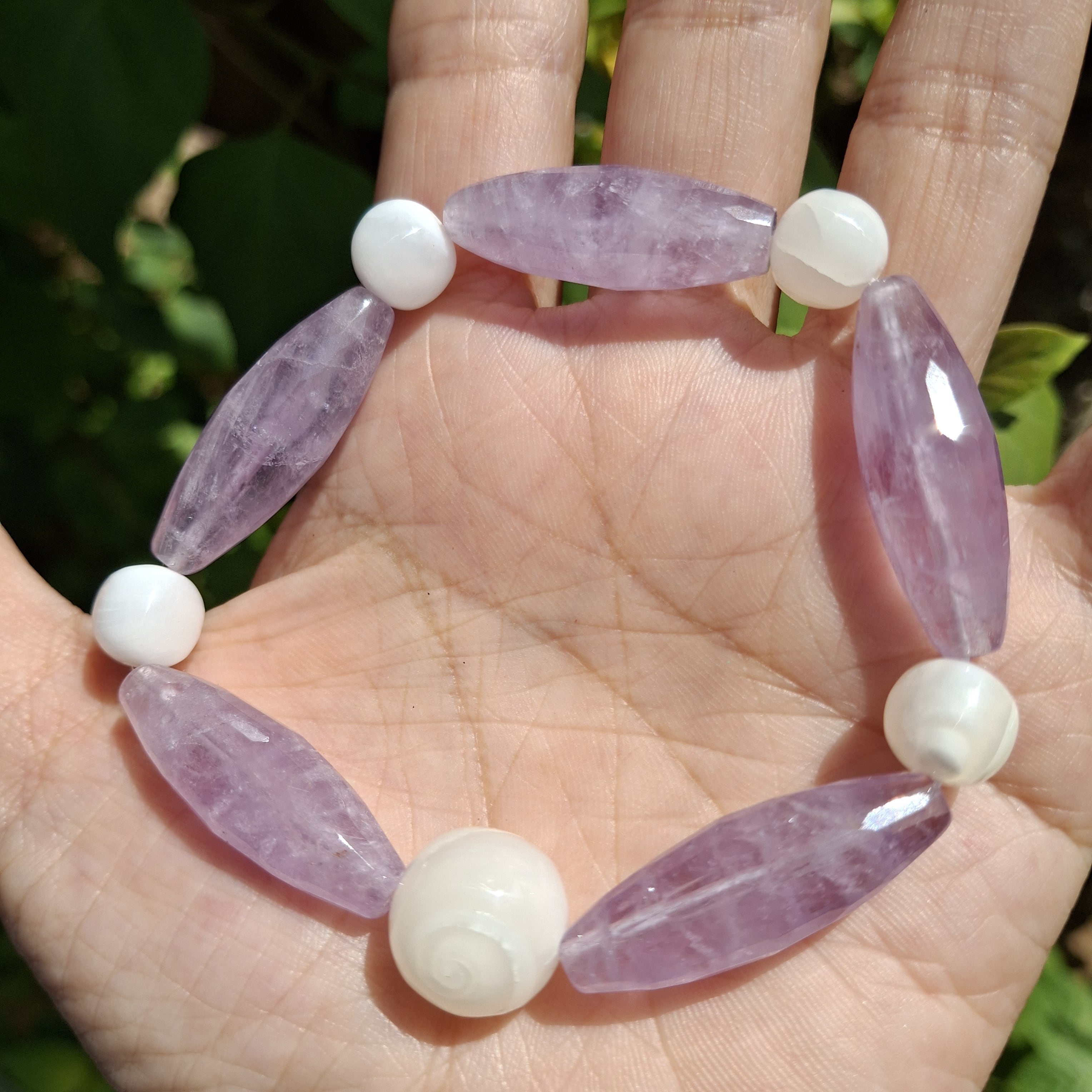 約13.5mmの大玉スパイラルケオンビーズと9mm玉芯ケオンビーズにとても綺麗で美しい色合いで、柔らかな波動を発するラベンダーアメジストを組み合わせたブレスレット。大きな楕円形(オーバル)のキラキラと光る多面カットが目を引き寄せます♥️