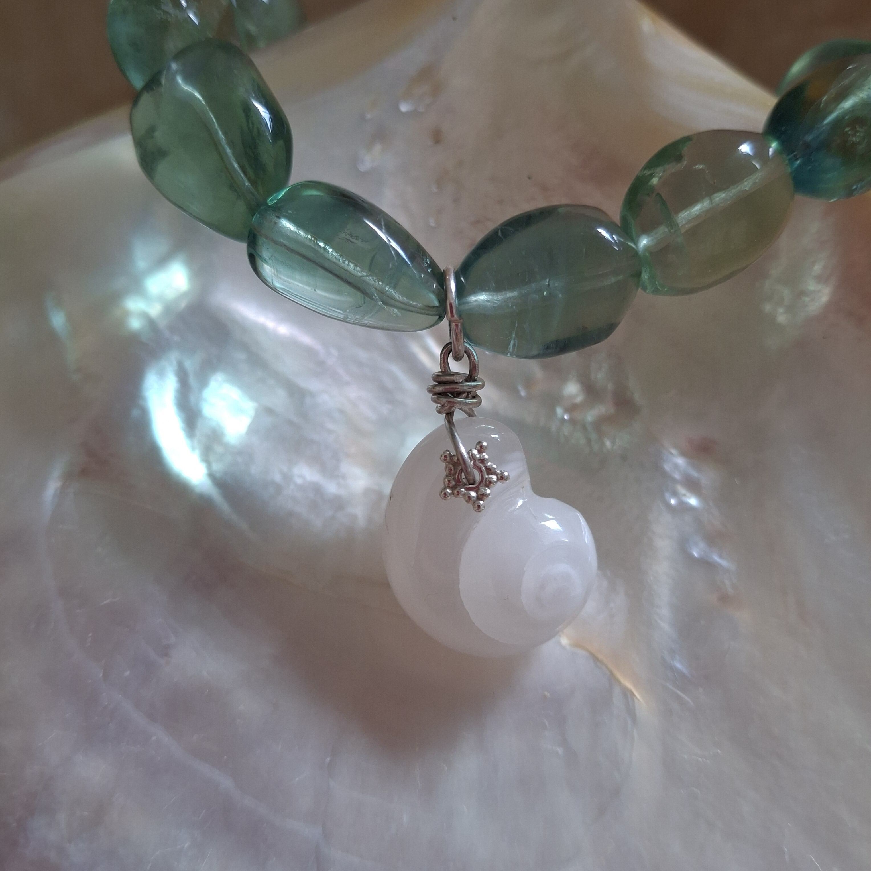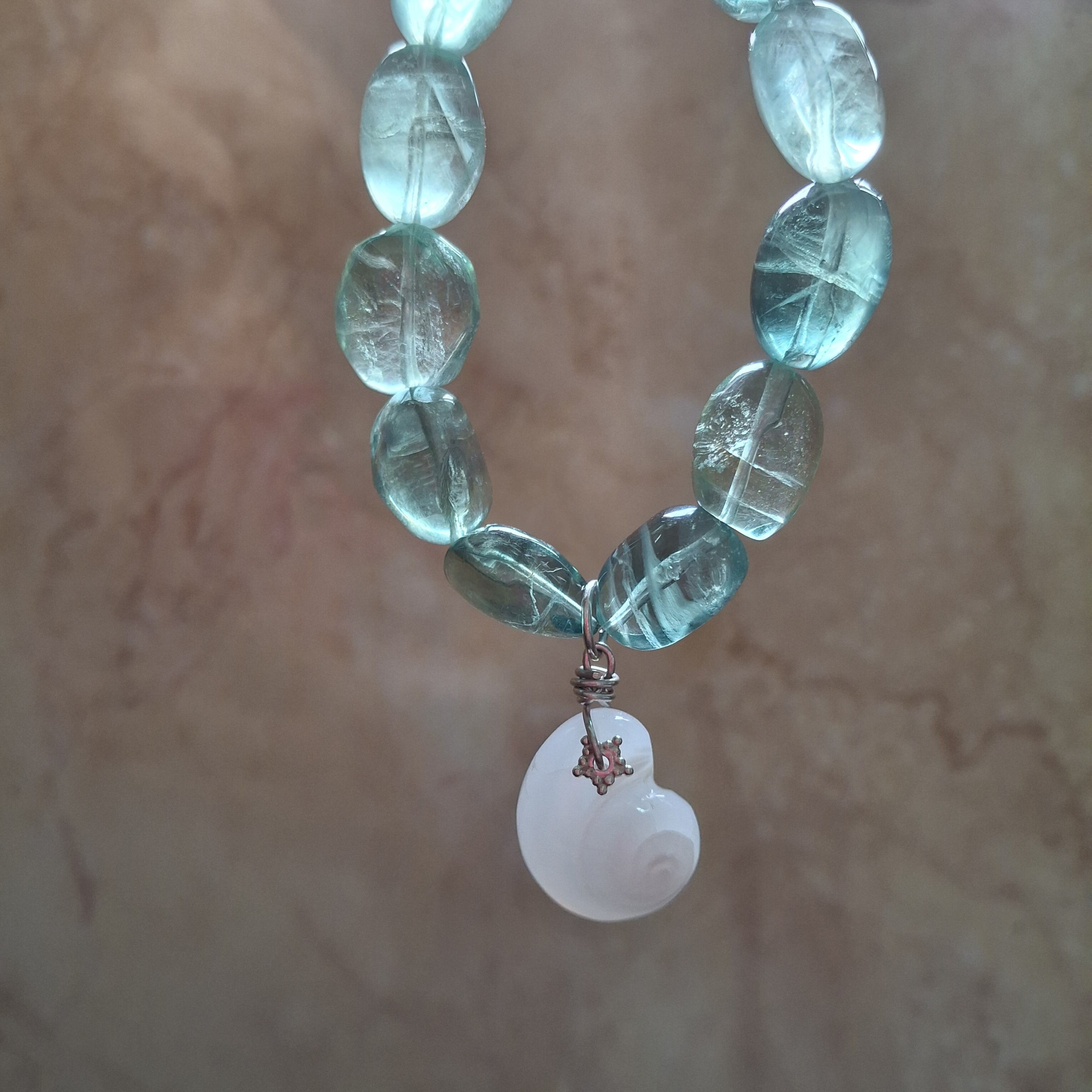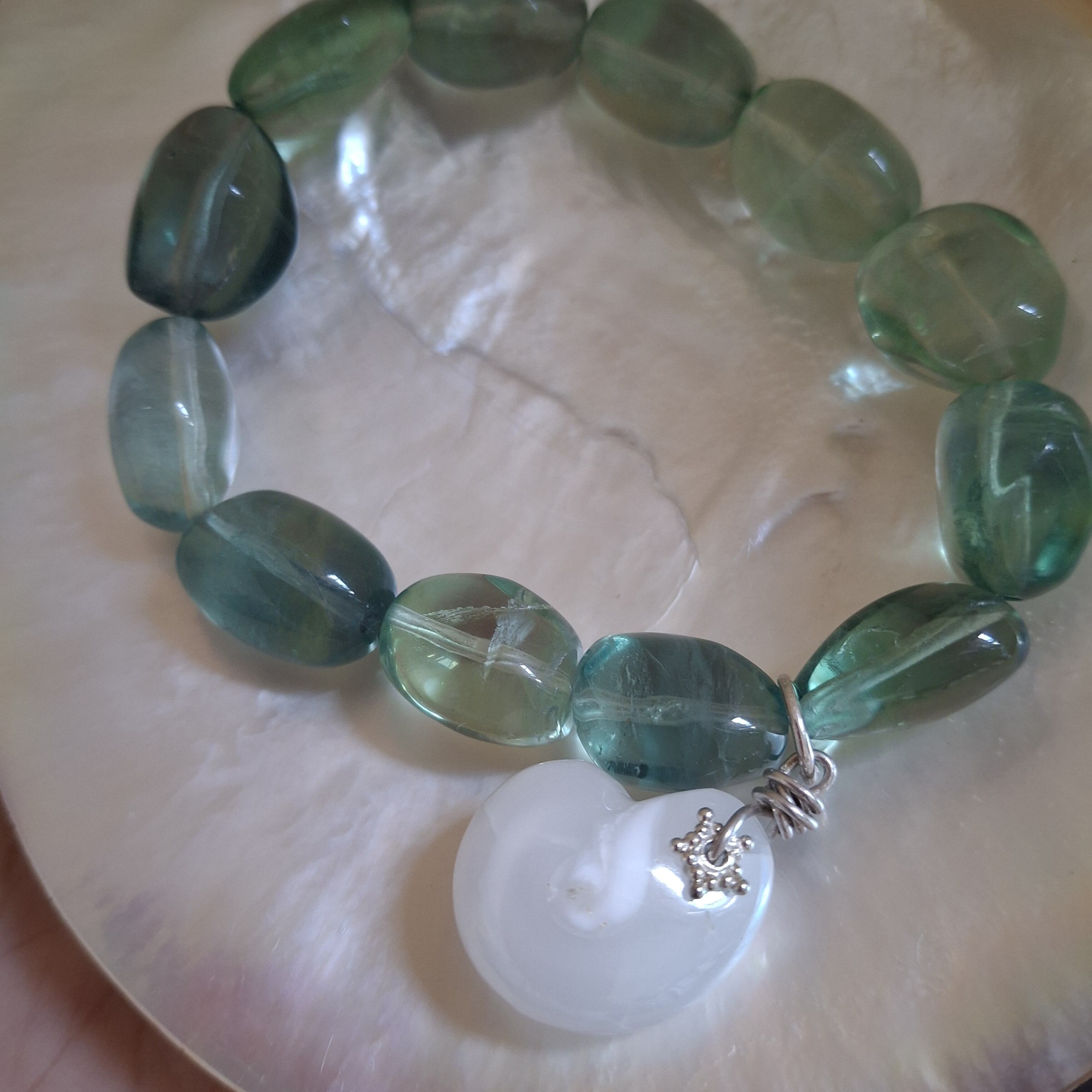 グリーンフローライトのブレスレットにシルバー加工したスパイラルケオンをドンと1つ付けました。インパクトありのブレスレットに仕上がってます♡
