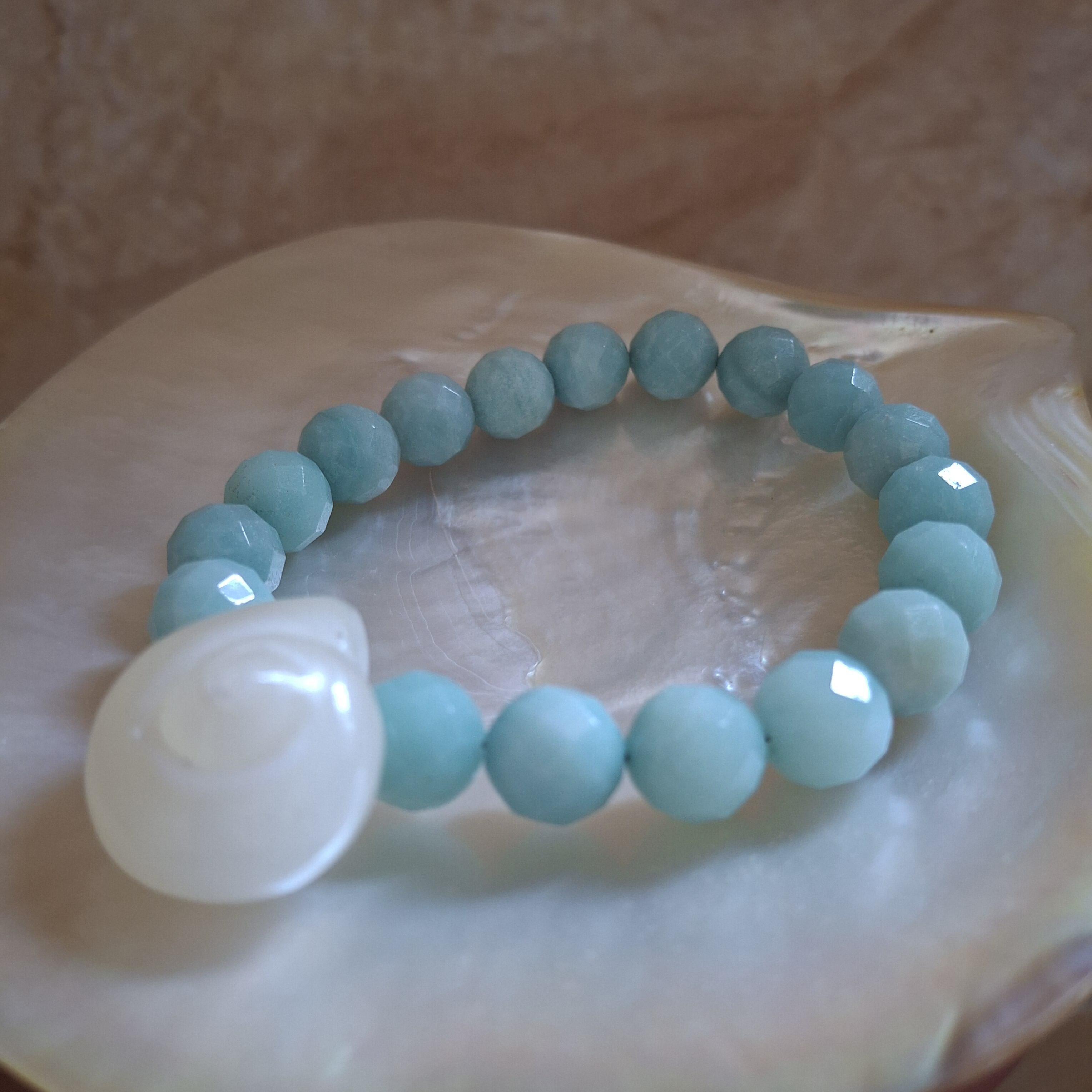 ミラーボールカットのアマゾナイトのブレスレットの中央に大きなスパイラルケオンをドンとあしらったブレスレット。アマゾナイトの優しいアクアブルーに癒されます♪