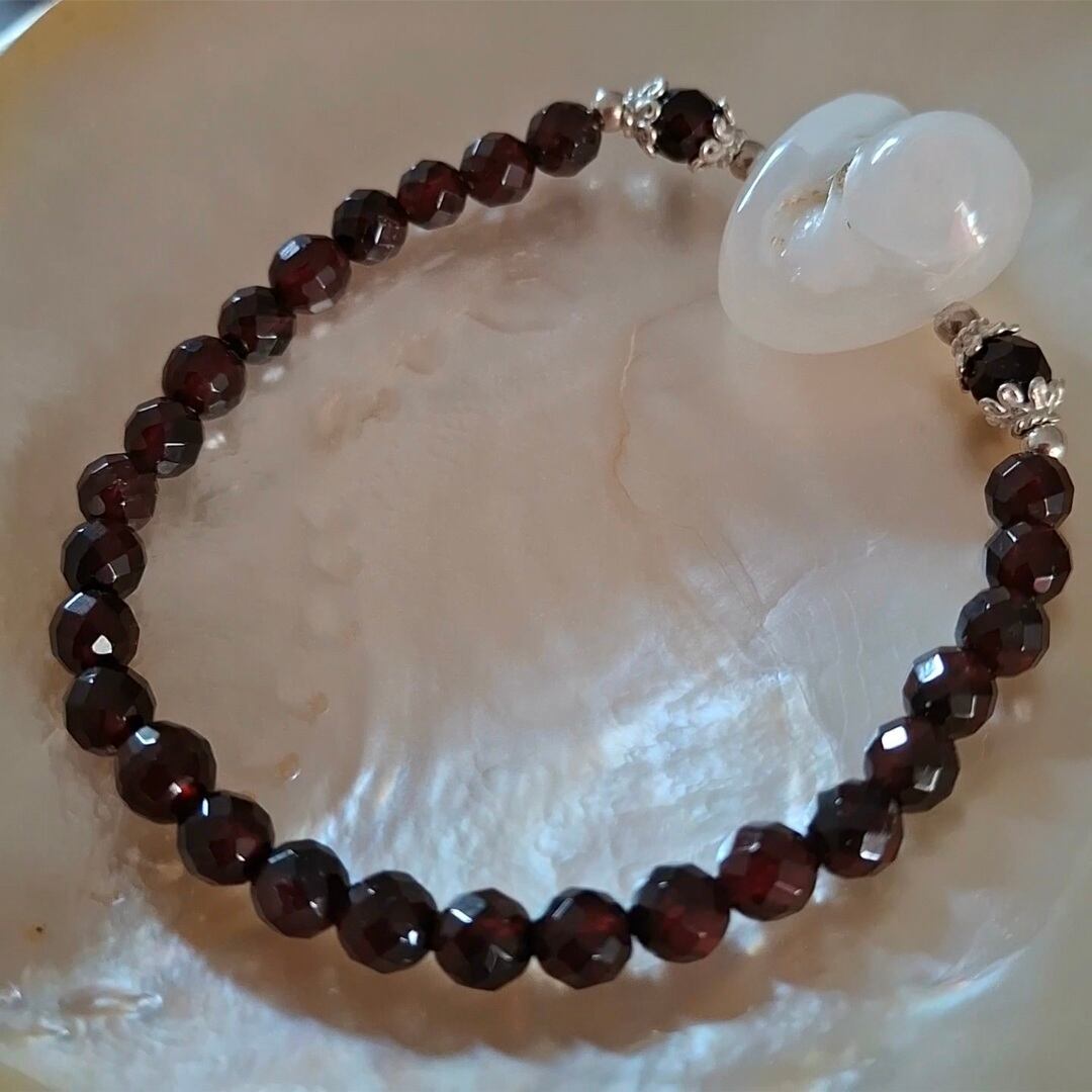 ミラーボールカットのガーネットとハート型のスパイラルケオンを組み合わせたブレスレット。ワインレッドカラーがとても美しい1月の誕生石ガーネット。シルバーパーツがアクセントになってとてもゴージャス感があります✨